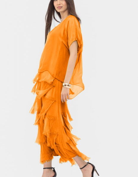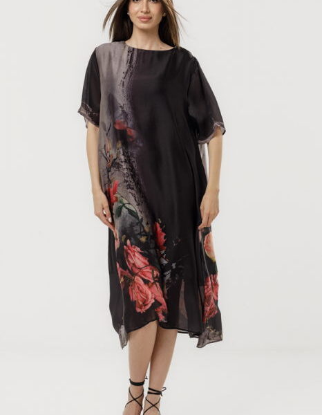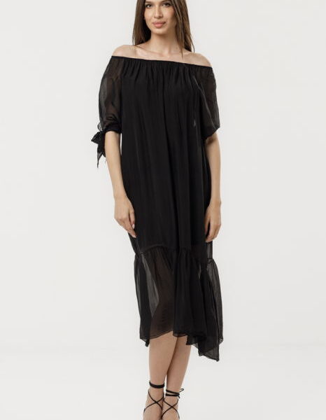 Rochie mov din matase si vascoza cu volane franjurate suprapuse